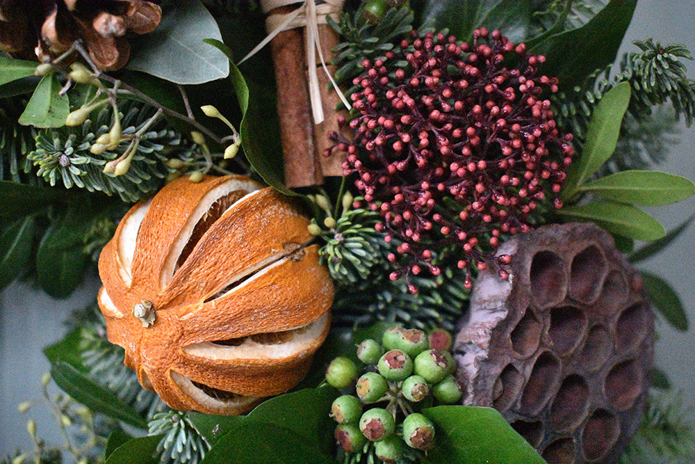 Mixed foliage, traditional decorations and a deep red velvet bow.